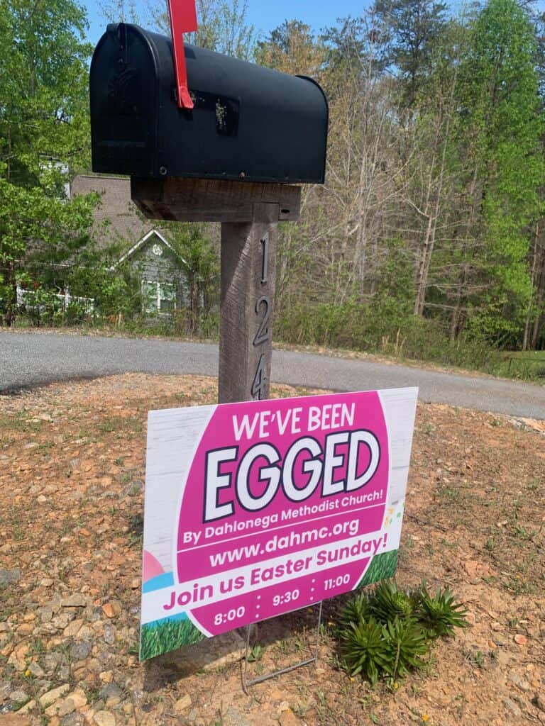 We drove to each family’s house and hid the 40 eggs in their front yard. We put the yard sign out by their mailbox. We asked them to leave the yard sign up through Easter as it was a way of inviting their neighbors to Easter morning services at our church. We taped the instructions sign to their front door or garage door so they would see it. And then we left for the next house!
