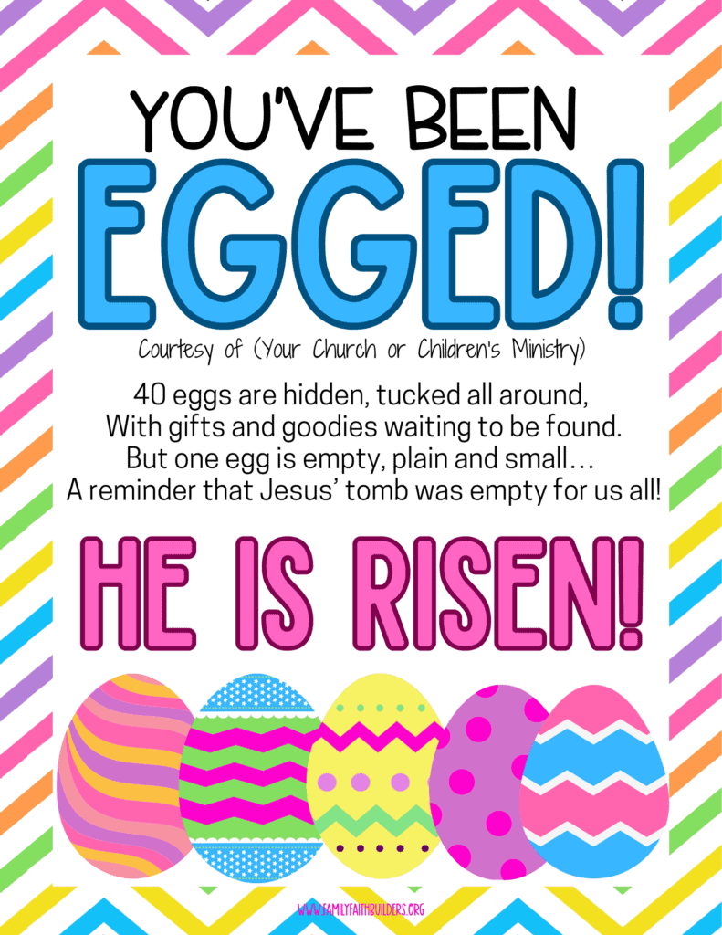 • 40 Easter eggs (39 stuffed with candy, quarters, mini Jesus figures, and other small toys, 1 empty egg that has “He is Risen!” written on the inside of the egg)We decided on 40 as it could represent the 40 days of Lent